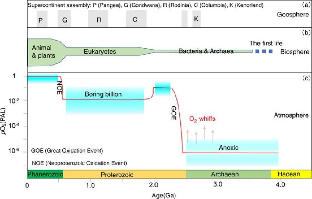 Fascinerend is dat het Galaconcert van een levende planeet, is terug te vinden in de manier waarop het leven op aarde zich ontwikkelde. In het bovenstaande overzicht is te zien dat er koppelingen zijn tussen de processen in de geosfeer, zoals de vorming van supercontinenten door de platen-tektoniek en de verandering van de samenstelling van de continenten in de loop van de tijd (a), in de biosfeer, met de ontwikkeling van het leven dat zuurstof produceert en nodig heeft (b) en in de ontwikkeling van de oceaan en de atmosfeer (c). Het eerste leven ontstond door een combinatie van factoren, onder anoxische omstandigheden in de oceaan en was er een zuurstofloze atmosfeer.